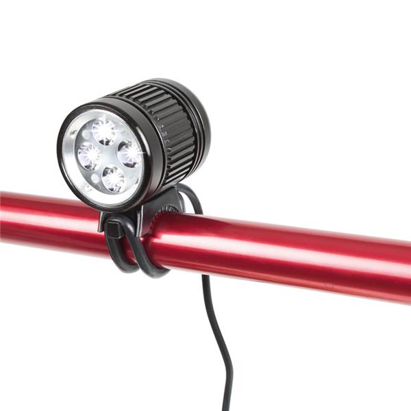 Cabezal de aluminio. 4 LED alto rendimiento CREE XP-G. Batería Li-ion 8,4 V/4.400 mAh. 500 ciclos de carga. Duración 2,2-7 h según intensidad. 4 funciones: intensidad 100%, 75%, 50% y 25%. Indicador luminoso nivel de carga de batería. Interruptor 2 posiciones (+/- potencia). Kit adaptador corriente 230 V, petaca batería y 2 anillos de goma para instalación en manillar bicicleta. Potencia máx: 1600 lumen. Alcance: 500 m.. Dimensiones: ø41x50 mm.. Peso: 345 g (con batería).