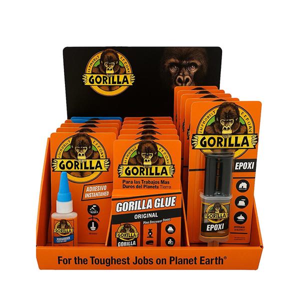 310x230xh.300 mm. Incluye: 6701B060 Adhesivo base poliurteano GORILLA Blue original 5 BL. 6701B015 Adhesivo instantáneo GORILLA 15 gr 6 BL. 6701B025 Adhesivo epoxy GORILLA 25 ml 10 BL.