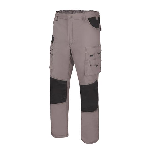 Tejido canvas. 65% poliéster 35% algodón. Cintura elástica. Refuerzo en rodillas y trasero. Doble costura seguridad. 10 bolsillos. Color gris/negro. Tallas: 38-52. Talla 42.