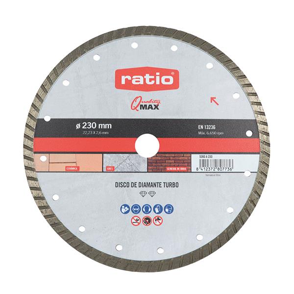 Soldadura sinterizado. Perfil turbo. Segmento 10 mm. Disco corte de diamante, para ámbito de aplicación general de obra universal, gres y cerámica. CONFORME A: EN 13236. ø 230x2,6 mm.
