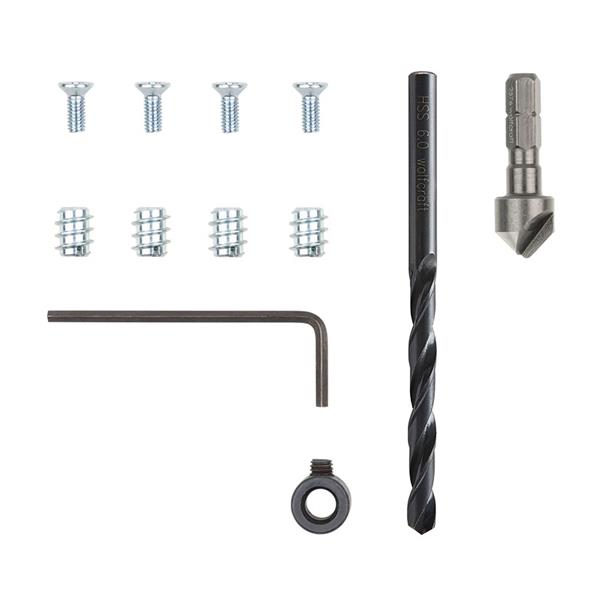 1 broca de HSS de forja por laminación, ø 6 mm. 1 tope de profundidad. 1 avellanador. 4 tuercas roscadas. 4 tornillos de cabeza avellanada. Cuerpo mueble. 11 piezas.