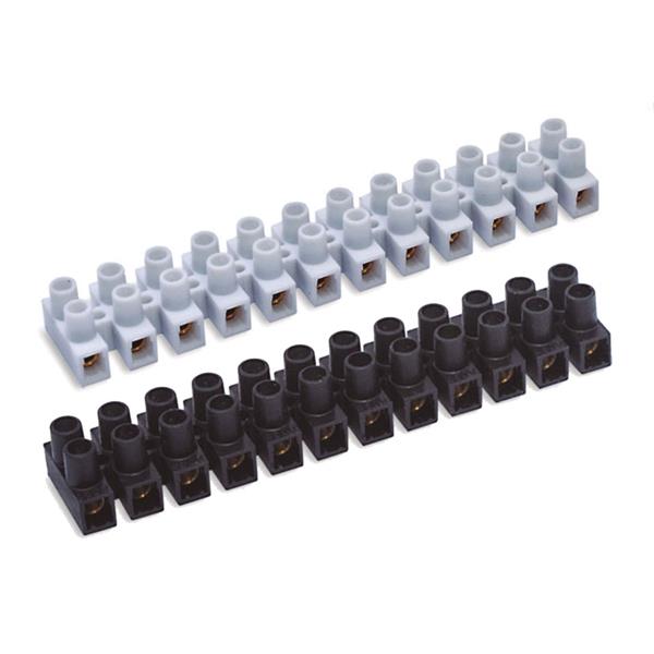 Tornillos imperdibles y montaje alto para facilitar la conexión. Fácil separación de los polos de forma manual. Polipropileno. Homologación EN 60998-1:2004, EN 60998-2-1:2004. RoHS y VDE. Pack de 10 unidades con 12 conexiones cada una. Sección 2,5 - 10 mm². 57 A. Negro.