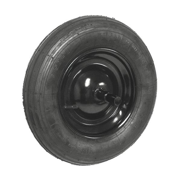 Juego de cámara y cubierta de 2PR lonas. Llanta de acero estampado con acabado pintado. Eje macizo soldado de acero 20x225 mm. Presión adecuada 2 kg/cm². ø 360x80 mm. Carga 150 kg.