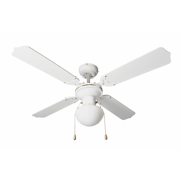 3 velocidades. Doble giro de las aspas para clima frío o circulación de aire. 4 hélices reversibles madera/rejilla. Lámpara E14 máx. 50 W. ( no incluida). VTR-1000. Lacado blanco. Potencia: 50 W. Ø hélice: 107 cm. Caudal aire: 8.100 m³/h.
